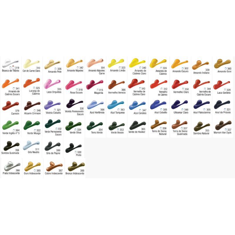 - Ref: 13108 – Estojo com 08 bisnagas 20 ml – Cores variadas: 312, 319, 320, 324, 330, 332, 348, 360 (Venda: 03 un / Caixa Master: 05 shrinks)